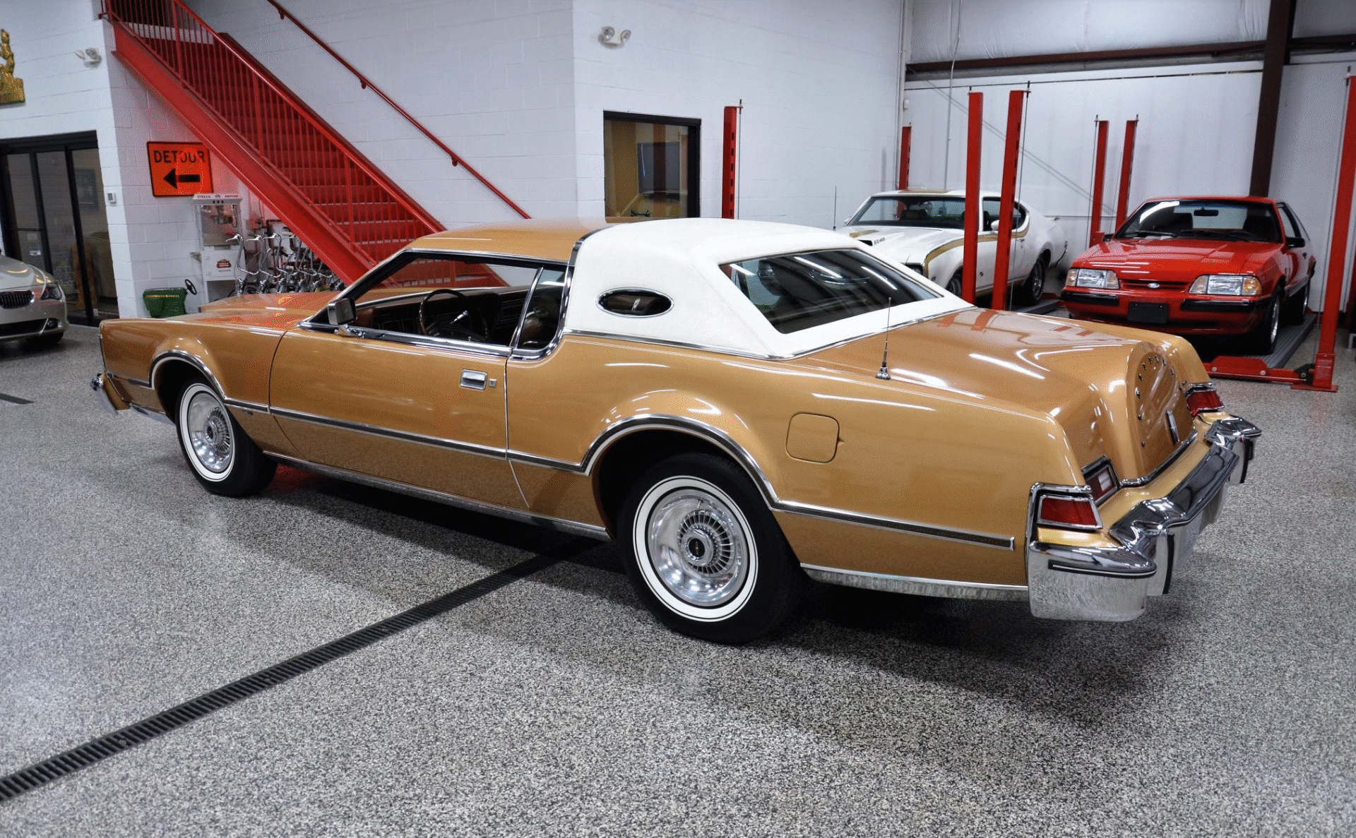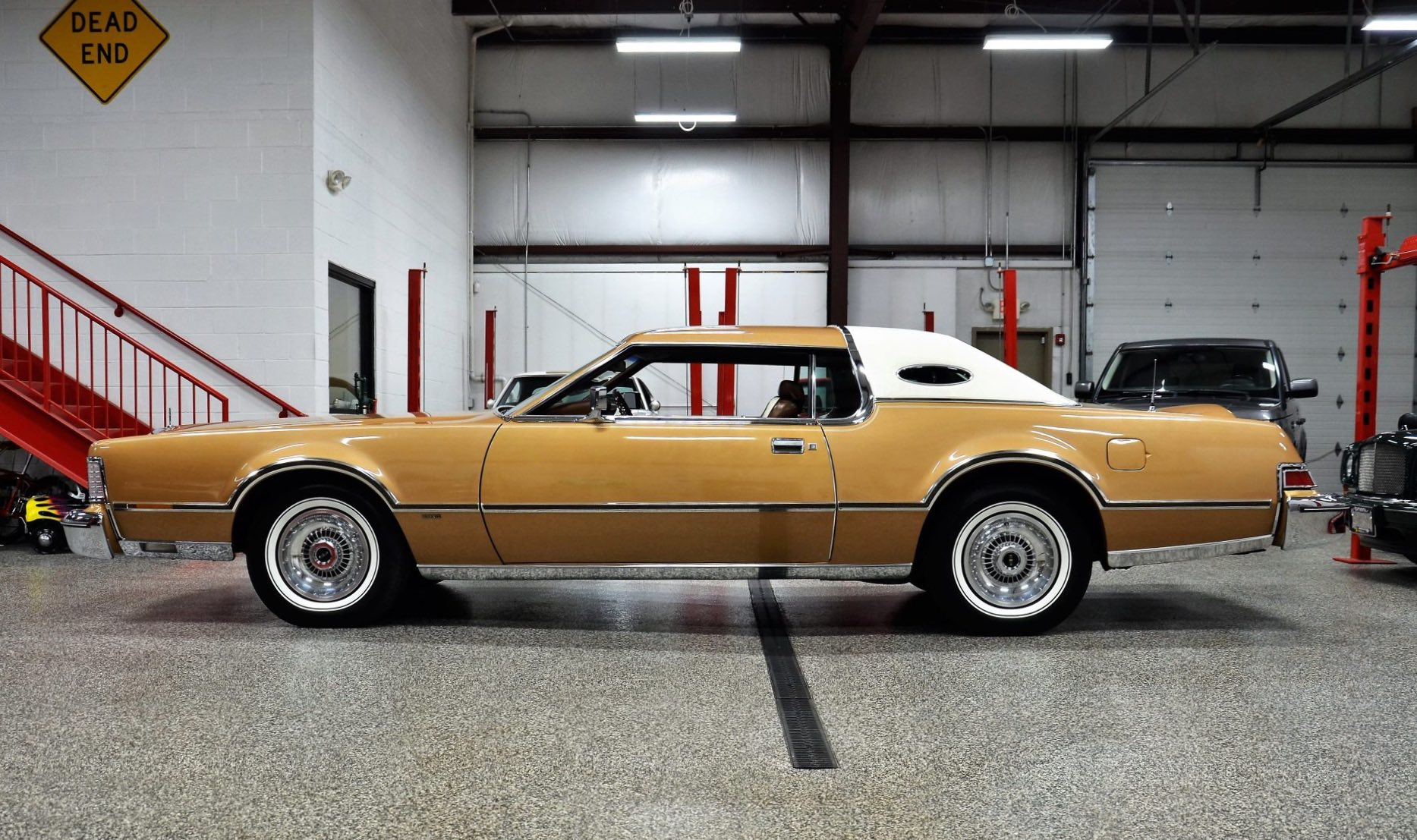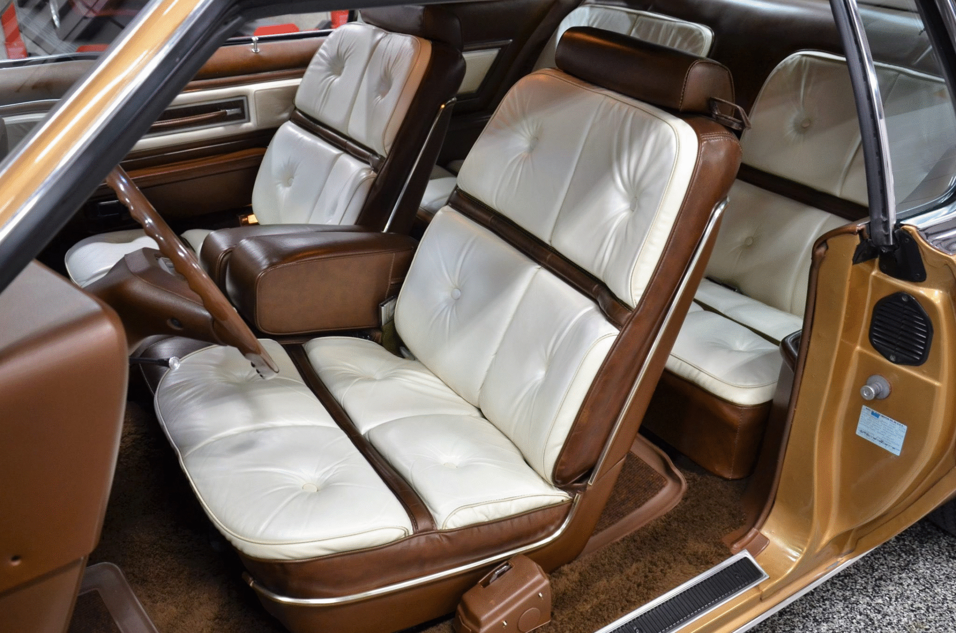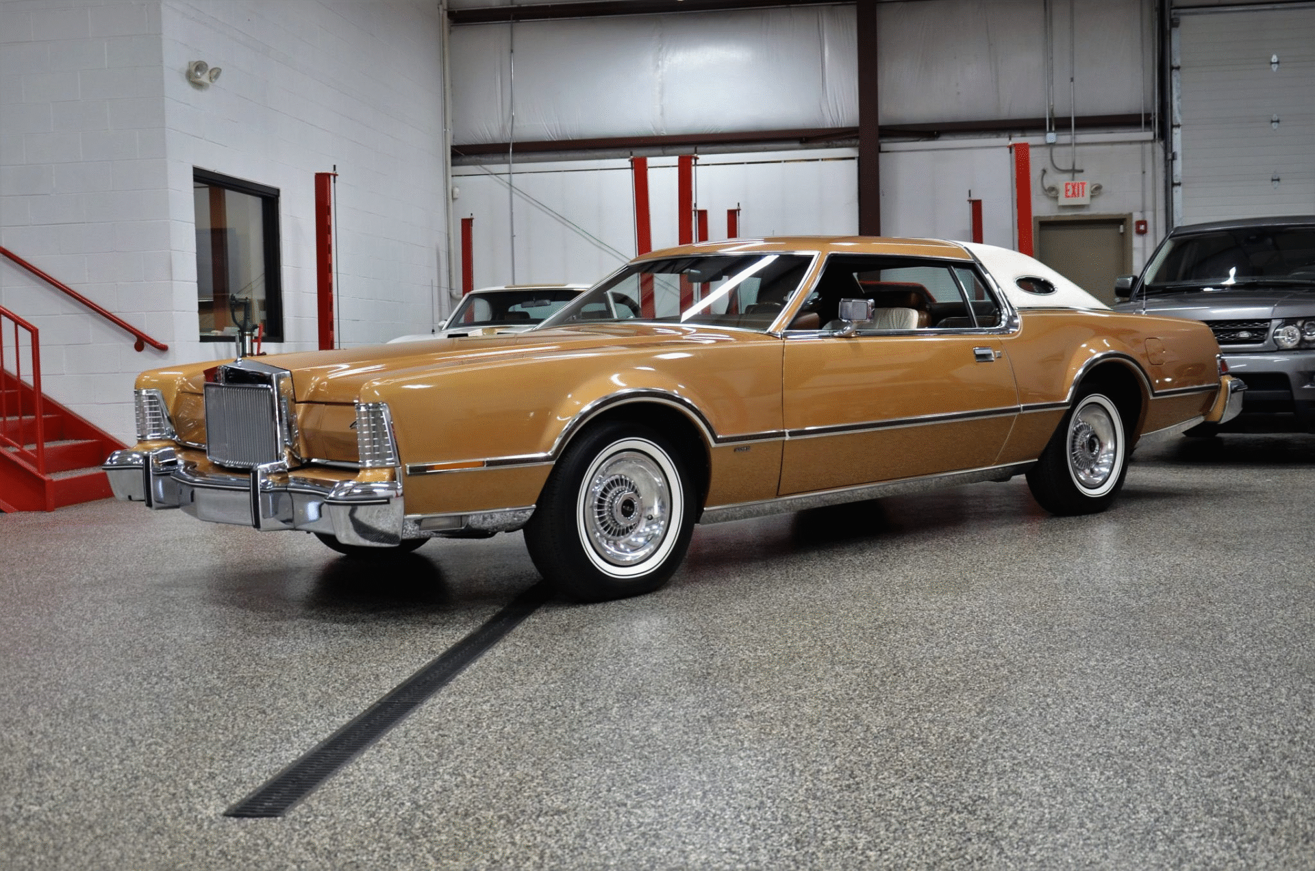 1975 Continental Mark IV finished in extremely rare Gold Diamond Fire Luxury Group (code 54) with White leather upholstery with Brown accents. The Continental Mark IV was a “personal luxury” car that was marketed by the Lincoln division of Ford Motor Company from the 1972 to 1976 model years. The Mark IV was a direct competitor to the 600 lb lighter but yet somehow much more battleship like feeling Cadillac Eldorado. The Lincoln was equipped with a 460 cu. in. V8 that managed a weezing 212hp and 3 speed automatic transmission giving the car stately performance. One can image an unhurried retired dentist arriving at the local country club in this stunning conveyance, without a care in the world for sporty handling or 0-60 times.
